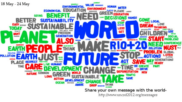<«Rio+20» es el nombre abreviado de la Conferencia de las Naciones Unidas sobre el Desarrollo Sostenible, que tuvo lugar hoy en Río de Janeiro, Brasil, veinte años después de la histórica Cumbre de la Tierra en Río en 1992. Río +20 fue también una oportunidad para mirar hacia el mundo que queremos tener en 20 años.