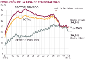 El uso —y, en muchas ocasiones, el abuso— de la contratación temporal ha dejado de ser coto exclusivo del sector privado desde hace bastante tiempo. Las tasas de temporalidad en las Administraciones superaron el 20% en el año 2000. Incluso siguieron creciendo en los primeros años de la crisis, cuando las empresas destruían empleo y las Administraciones públicas lo creaban. Tanto es así que entre julio y septiembre de 2009, se produjo un hito en el mercado laboral español: la temporalidad en el sector público (26,2%) superó la del privado (25,9%). Nunca había ocurrido y nunca ha vuelto a ocurrir.