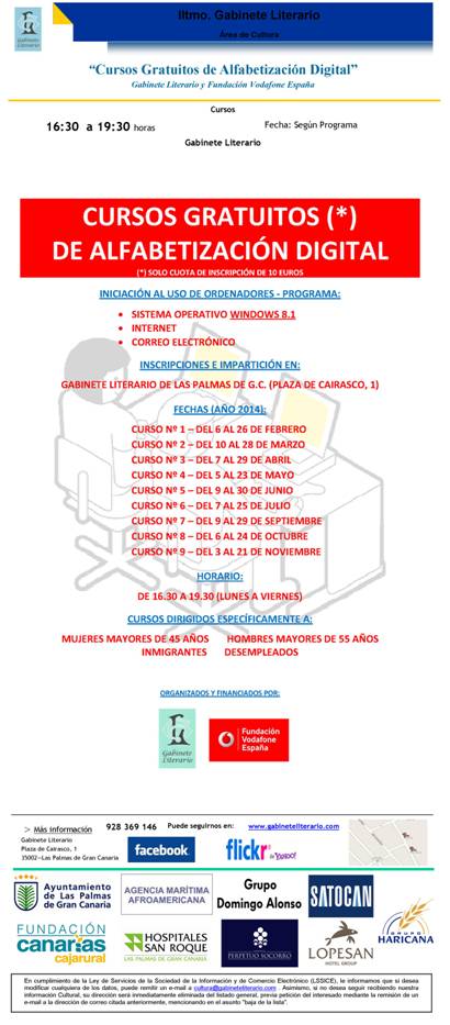 Vodafone Canarias, va a impartir cursos gratuítos de alfabetización digital durante todo el 2014 en el Gabinete Literario, Las Palmas de Gran Canaria.