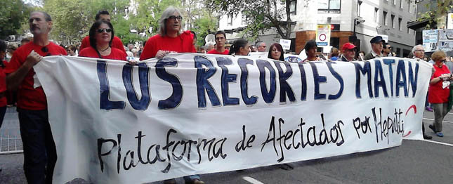 Während die korrupten PP-Regierung hat 200.000 Millionen Euro für den Banken zu retten, 2.400 Milliarden zur Rettung von Unternehmen Mautstraßen, 1.350 Mio. sie bereits gezahlt, um das Unternehmen durch ACS von Florentino Perez zu kompensieren BEAVER Federung, sterben zwölf Menschen jeden Tag Projekt in unserem Land für die nicht in der Lage, Zugang zu einer Behandlung, die heilt und die Regierung leugnet. Die Betroffenen leiden nicht mehr eine Situation, die uns führt, um es als ein Verbrechen gegen die Menschlichkeit, die durch die Nichtbeachtung Linderung gebracht definieren.