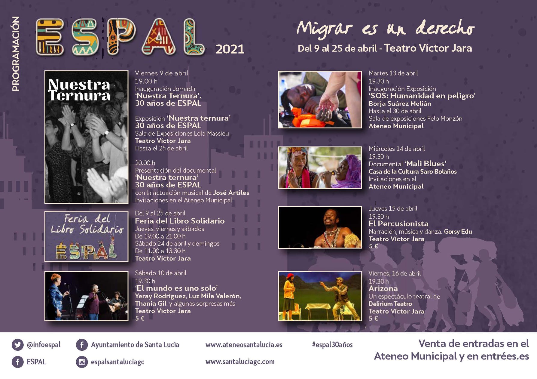 El ESPAL se celebrará del 09 al 24 de abril del 2021 en el teatro «Víctor Jara» del municipio grancanario de Santa Lucía de Tirajana y cuyas actividades se centrarán en la siguiente mirada: la vida comienza con la migración y son precisamente las migraciones las que han conformado el mundo tal y como lo conocemos en la actualidad. Y cuyo lema es: «Migrar es un derecho».