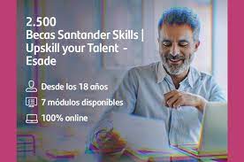 Banco Santander y Esade, institución global, conocida internacionalmente por la calidad de su educación y líder en los rankings más prestigiosos del mundo en Desarrollo Profesional, ofrecen un total de 2.500 becas dirigidas a mayores de 18 años, para impulsar tu carrera, desarrollando competencias en: Liderazgo, Creatividad, Productividad Personal, Influencia e Inteligencia Emocional, Negociación , Comunicación o Resolución de Problemas Complejos y Tomas de decisiones, dependiendo del módulo escogido. Los participantes podrán elegir uno de los siete módulos de digital training, disponibles en español, inglés y portugués, para la mejora de tus habilidades.