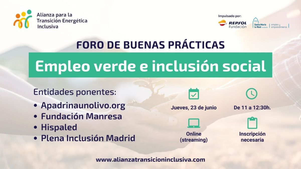 Bajo el título ‘Empleo verde e inclusión social’, la Alianza para la Transición Energética Inclusiva reunirá en este evento online y gratuito a cuatro entidades adheridas a la red multiagente, con el objetivo de intercambiar conocimientos adquiridos a través de sus proyectos y poder generar sinergias con otras entidades asistentes.