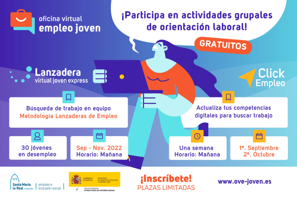 La Oficina Virtual de Empleo Joven contará a partir de septiembre con dos actividades grupales, totalmente gratuitas, para mejorar la empleabilidad e impulsar la inserción laboral de jóvenes en desempleo de 16 a 35 años: