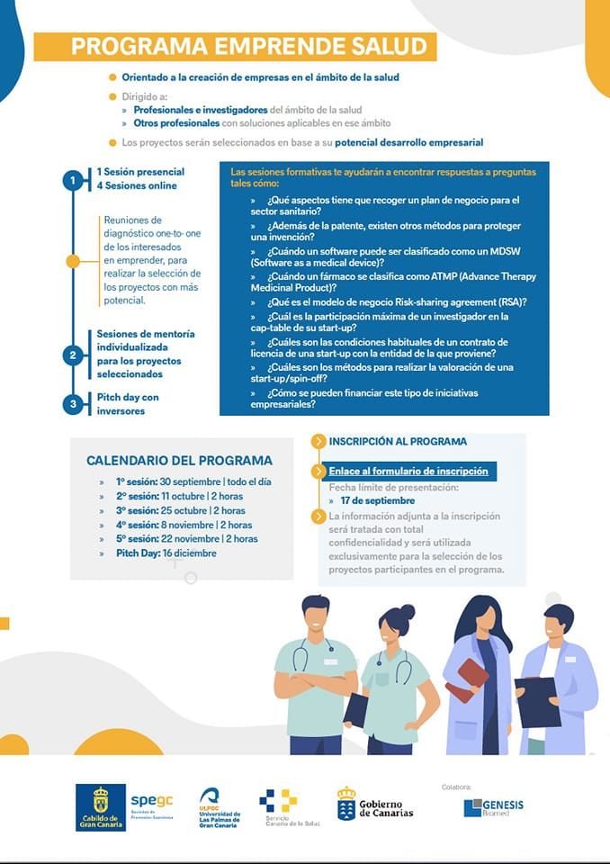 El Servicio Canario de Salud, el Cabildo de Gran Canaria, a través de la Sociedad de Promoción Económica de Gran Canaria (SPEGC), y la Universidad de Las Palmas de Gran Canaria colaboran para desarrollar el Programa Emprende Salud, con la intención de promover el emprendimiento en el sector sanitario.