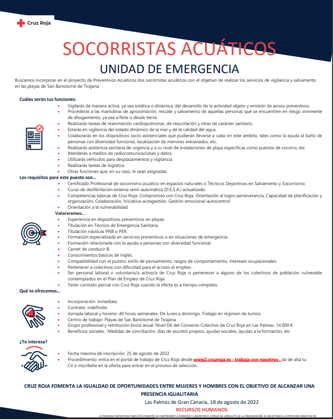 Empleo; Socorristas acuáticos , Playas de San Bartolomé de Tirajana, Gran Canaria