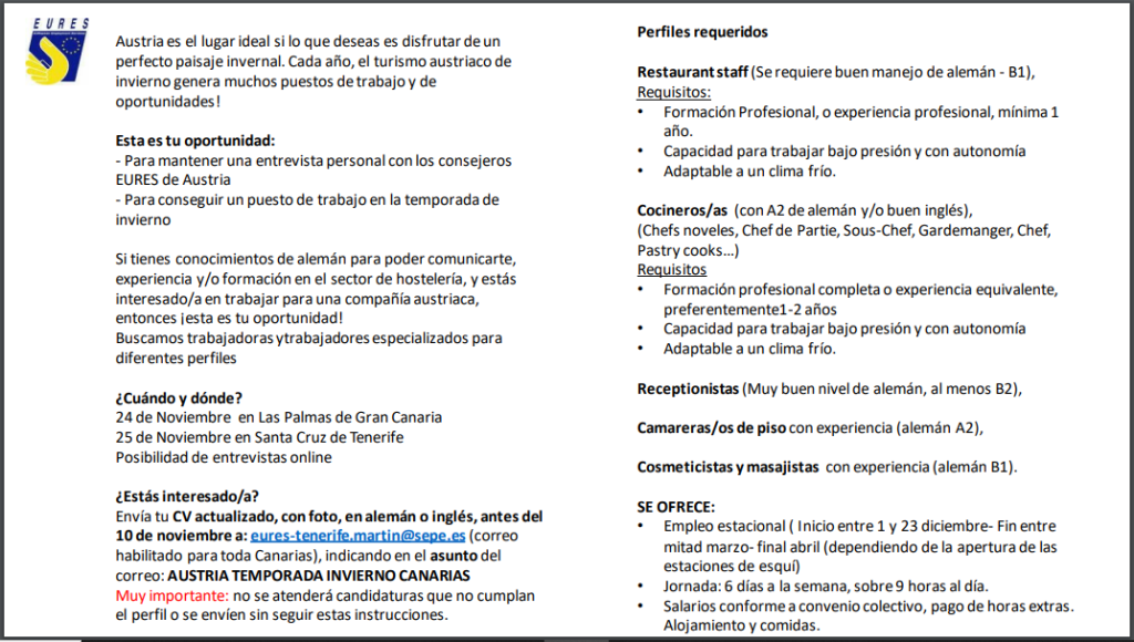 La razón es que la red de cooperación europea de servicios de empleo, diseñada para facilitar la libre circulación de los trabajadores, (EURES) gestiona diversos procesos selectivos para trabajar en la campaña de nieve en Austria.