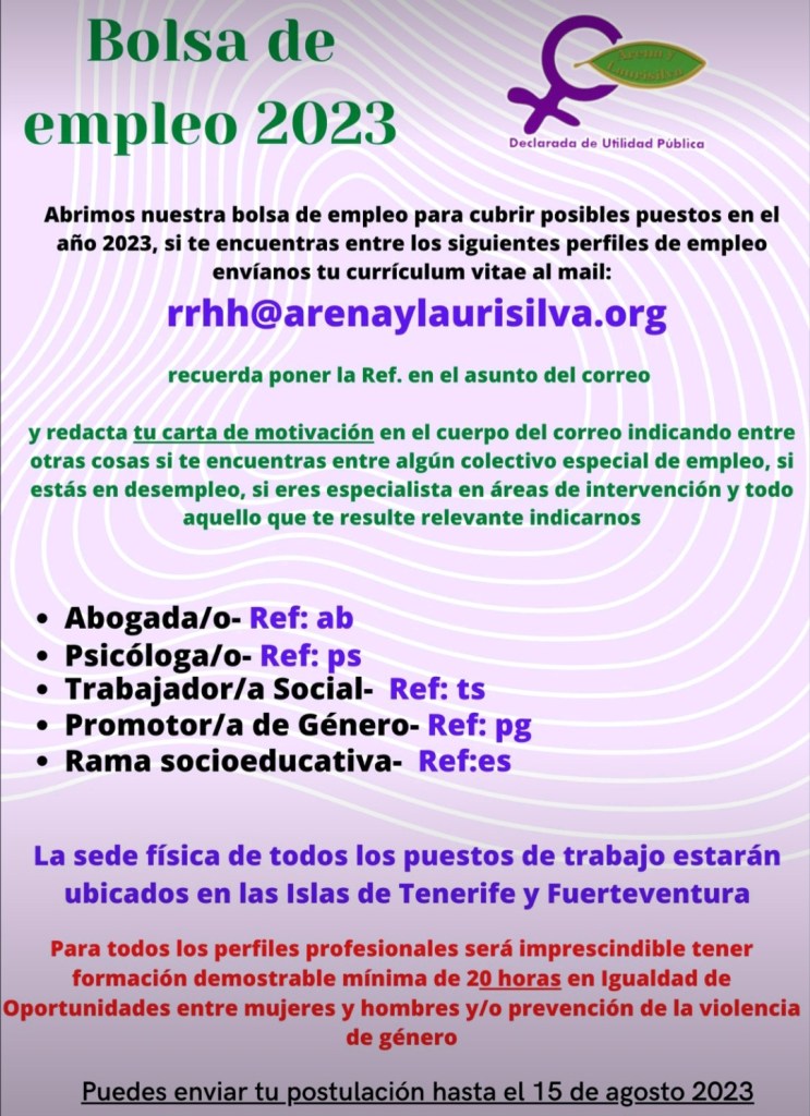 La Asociación «Arena y Laurisilva» necesita abogados/as, psicologos/as, trabajadores/as sociales, promotores/as de género y de la rama socioeducativa para la creación de una bolsa de empleo. El plazo para el envío del CV termina el 15 de agosto. Tenerife y Fuerteventura.