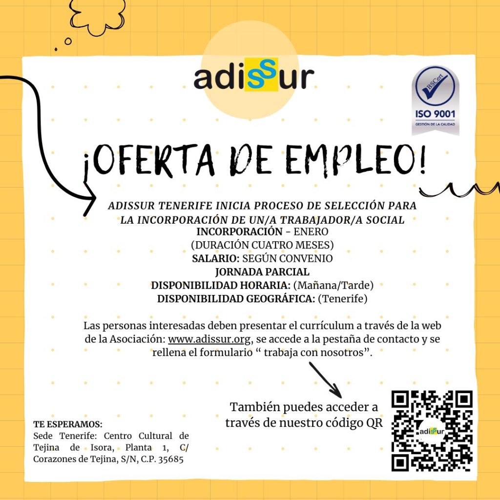 La Asociación ADISSUR Tenerife se encuentra en proceso de selección de personal para ocupar el siguiente puesto: Trabajador/a social.
