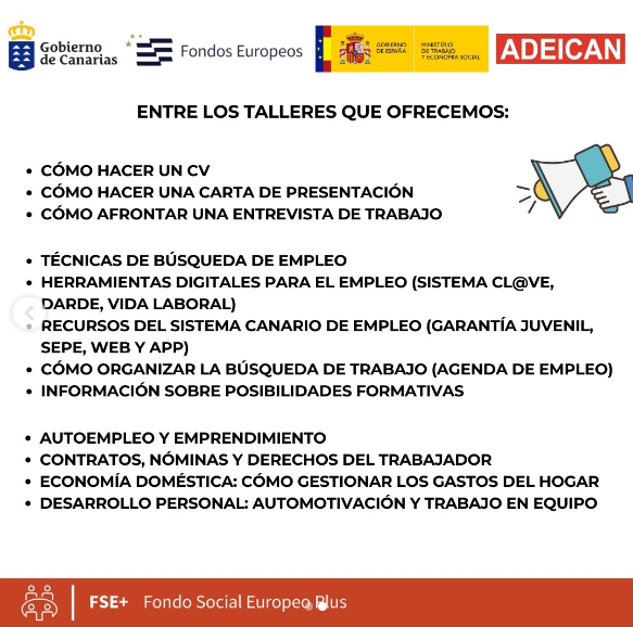 ✔️ Ofrecemos talleres gratuitos sobre técnicas de búsqueda de empleo, herramientas digitales, recursos del sistema canario de empleo, organización de la búsqueda de trabajo, información sobre formación y más.