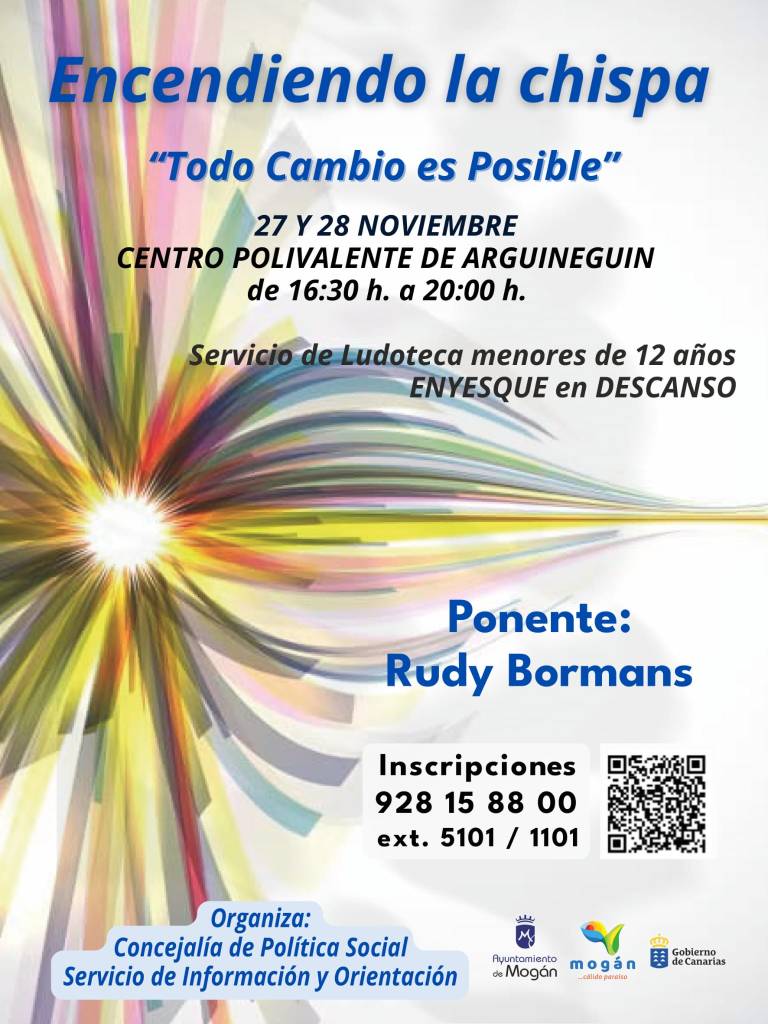 La actividad, totalmente gratuita, tendrá lugar miércoles 27 y el jueves 28 de noviembre en el Centro Polivalente de Arguineguín de 16:30 a 20:00 horas. Al frente estará Rudy Bormans, fundador, director y coach de Rudy Bormans Coaching. El belga ha ofrecido más de 1.000 conferencias en los últimos 10 años.